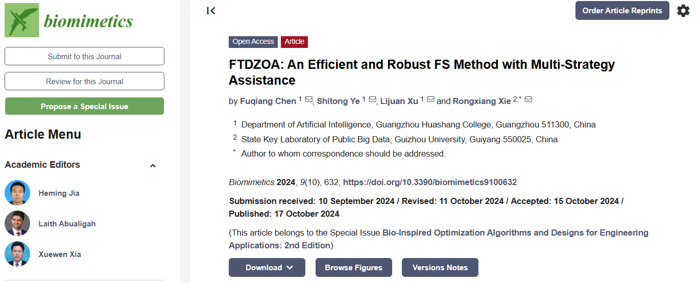 近日,2138cn太阳集团城教师陈富强以第一作者身份在《Biomimetics》期刊发表了题为“FTDZOA: An Efficient and Robust FS Method with Multi-Strategy Assistance”的论文,该期刊属于SCIE检索期刊,是JCR Q1分区,中科院三区。