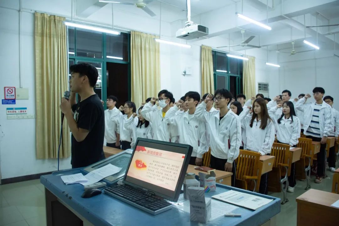 在林维跃同志的带领下,新党员宣读入党誓词。入党誓词:我志愿加入中国共产党,拥护党的纲领,遵守党的章程,履行党员义务,执行党的决定,严守党的纪律,保守党的秘密,对党忠诚,积极工作,为共产主义奋斗终身,随时准备为党和人民牺牲一切,永不叛党。