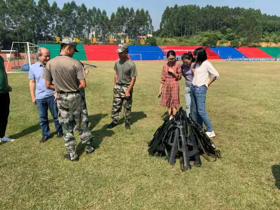 赖庆副院长以及各位老师在承训教官的带领下,参观参训新生军训所用的道具——枪支。承训教官向各位老师介绍了枪支,并示范正确的枪支使用动作。教官表示,作为一名军人,要牢记保卫祖国的使命,枪支是保卫祖国的武器之一,参训新生使用枪支训练可以让他们更直观的感受到保卫祖国责任之重,意识到作为一名大学生应当担当时代责任,报效祖国。