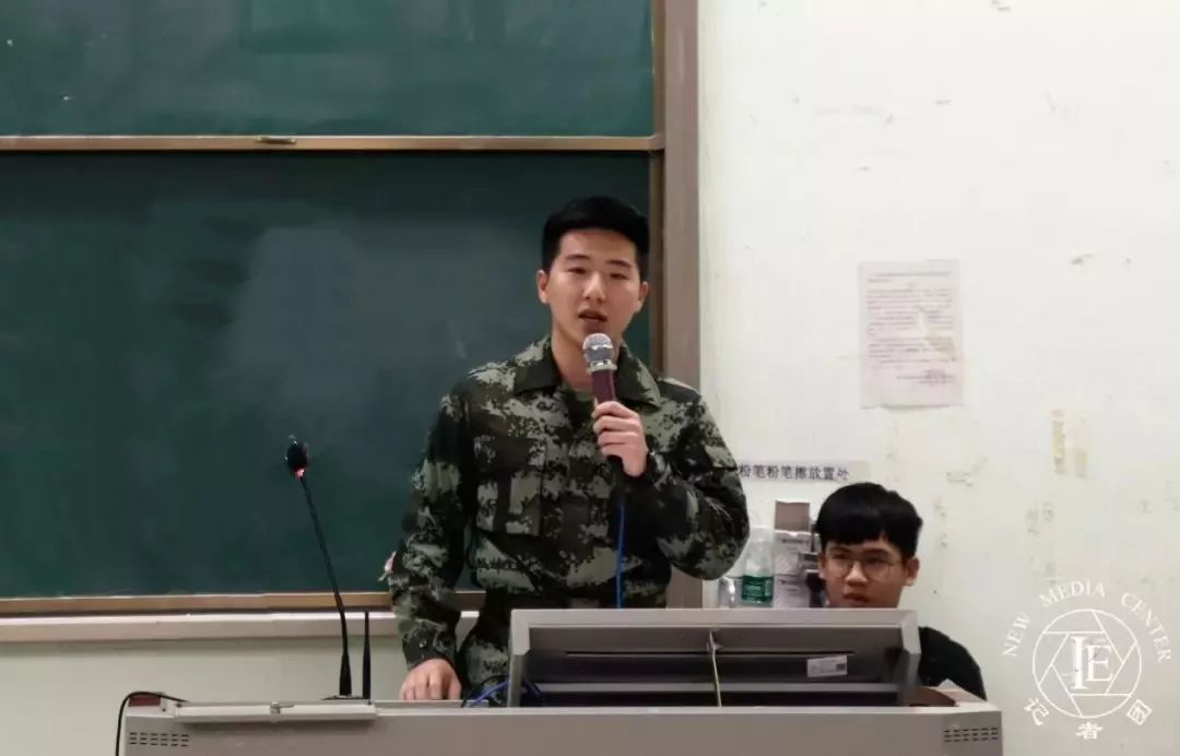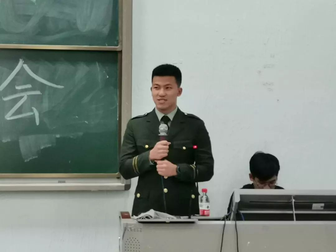 随后是任伯聪师兄发言。作为武警参军的任伯聪师兄,他通过自身生活中的点滴以及部队训练中的艰苦展现了军人真正的魅力。