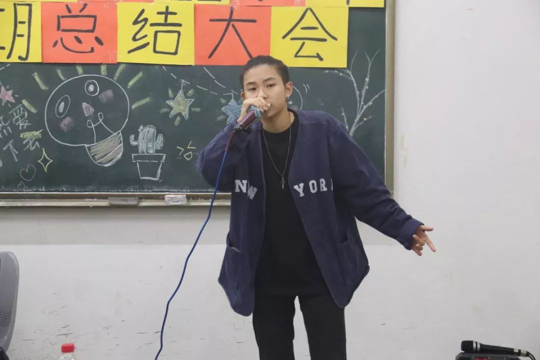 站长陈浩彬师兄和心委部干事屠厚望给大家带来一首《说好不哭》。两大歌神深情对唱,观众掌声不断。副站长翁鸿展师兄打beat,宣传部干事邓益记rap的《苦行僧》将全场气氛推入高潮。在表演完后,第六届数据科学学院心理健康站第一学期总结大会暨表彰大会在其乐融融的气氛中宣布闭幕。