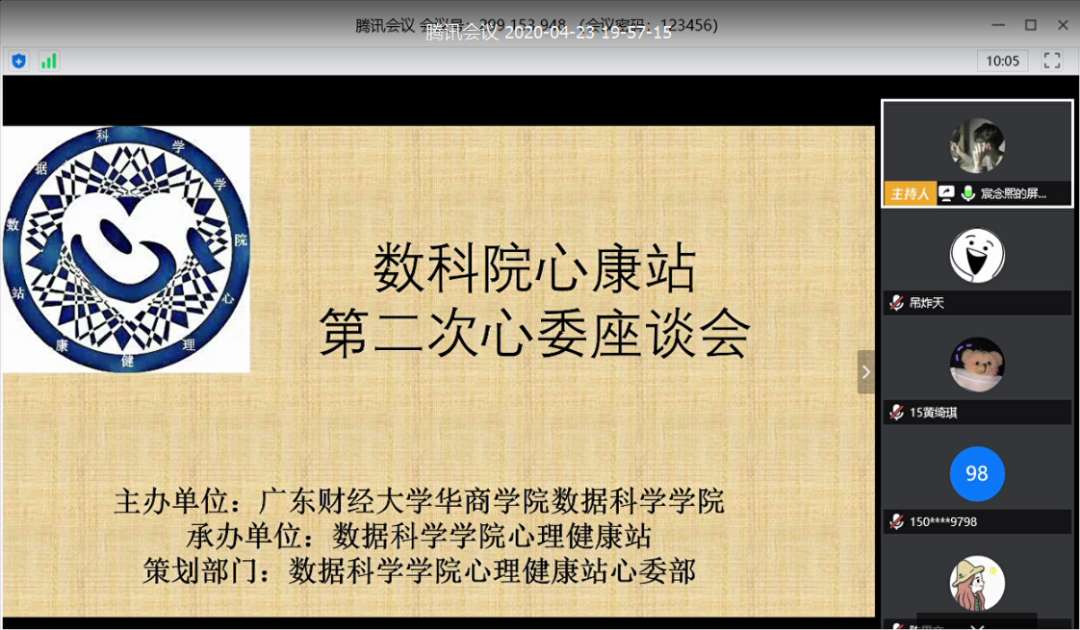 2020年4月23日,数据科学学院心理健康站开展了本学年第二次心理委员座谈会。此次会议采用线上开展的方法,在腾讯会议平台上与各班心理委员敞开心扉,了解学生的生活情况与思想心理动态,最后针对所提问题,给出建议和方法。