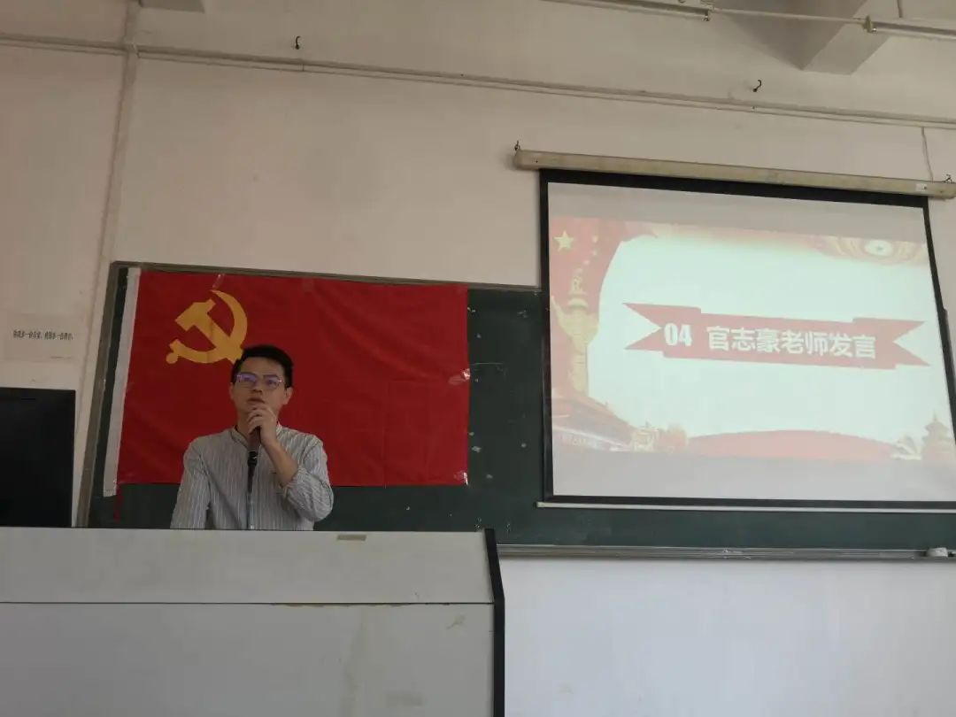大会第五项:官志豪老师总结发言。官志豪老师强调,通过此次深入的学习,支部党员同志应该提高自身的党性修养,在组织生活中要严于律己,身体力行,充分发挥党员先锋模范作用,以更高的党员标准要求自己,用青春谱写新篇章,用热血与激情铸就中国梦,发扬大学生党员脚踏实地,不怕艰难,勇于实践的精神,展现大学生党员青春激昂的风采。