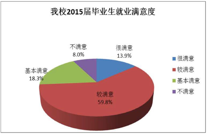 根据我校对 2015 届毕业生开展的就业满意度调查,毕业生对目前工作感到很满意的比例为 13.9%,较满意的为 59.8%,基本满意的为18.3%,就业满意度合计92%。