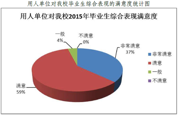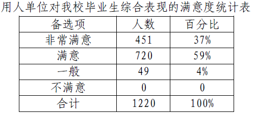 用人单位对我校毕业生综合表现非常满意为37%,满意为 59%,满意率合计 96%,这说明我校毕业生的综合素质得到用人单位的认可,反映出我校教学质量良好。