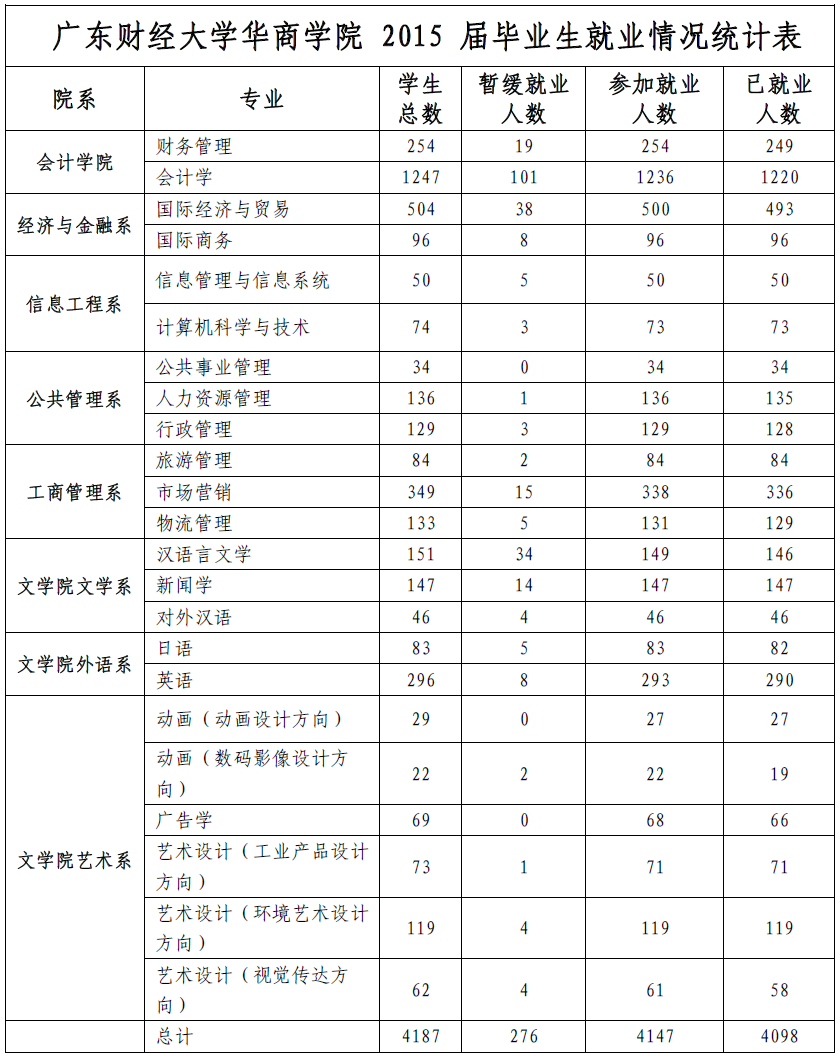 根据广东省教育厅粤教毕函【2015】35 号文,2015 年全省共有 49.35 万高校毕业生,截止 2015 年 9 月 1 日,我省 2015 年普通高等学校毕业生初次就业率为94. 80%(其中研究生为 90.19%,本科生为 94.08%,专科生为 95.91%)。我校 2015 届毕业生(均为本科)初次就业率为98.82%,高于全省的平均水平。