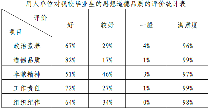 用人单位对我校本科毕业生各方面评价均比较高:政治素养、道德品质、奉献精神、工作责任、组织纪律等满意度均在 96%以上。请参看下表。