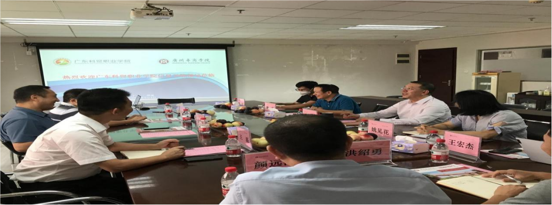 2023年9月4日,广东科贸职业学院信息学院院长钱英军、副院长朱冠良、副院长王磊一行来到2138cc太阳集团数据科学学院调研交流,受到学校吕峻闽副校长热情接待,陪同交流的还有我院常务副院长赖庆、学校招生办主任姚见花、院长助理杨波、计算机科学与技术系主任黄富平、软件工程系副主任王宏杰、数据科学与大数据技术系主任颜远海、人工智能系副主任洪绍勇等。