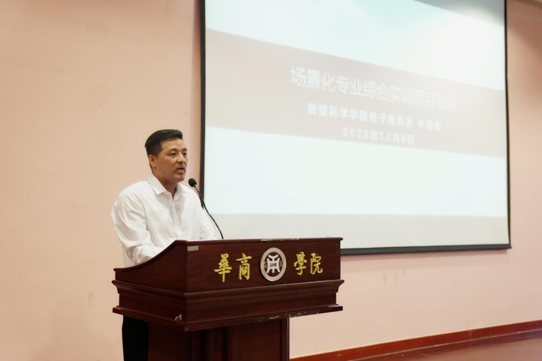 随后,电子商务系主任李加军围绕项目概况、项目实施方式、考核方式、项目成果展示及下一步优化方向进行项目总结。他提到:此次场景化实训是重大的课程改革,参与学生人数229人,分成36个直播团队,实施校企双导师制以达到学践思悟的教学目标。整个实施过程采取“两融合、三阶段、四平台、五递进”的方式以小组形式在校内开展课程考核改革,项目成果显著,最后提出下一步优化的方向。