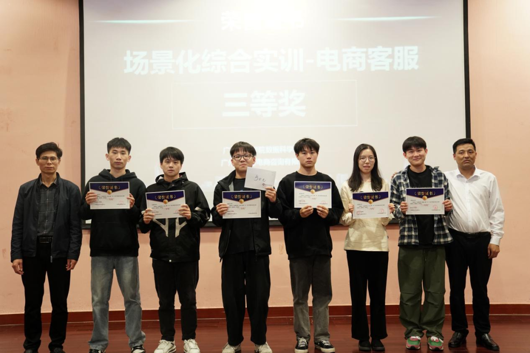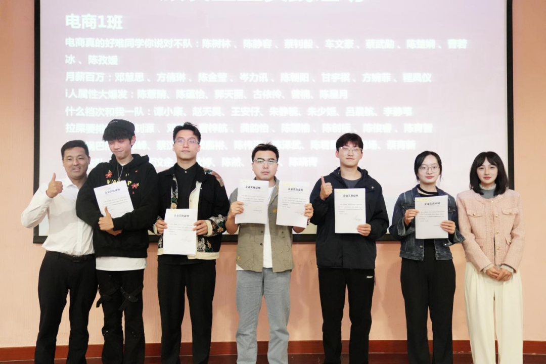 随后,进入企业实践证明和获奖荣誉证书的颁奖环节。14位优秀学生代表获得电商客服荣誉证书,6个直播小组获得电商直播实训荣誉奖项,与会领导颁发了证书及奖金并合影留念。