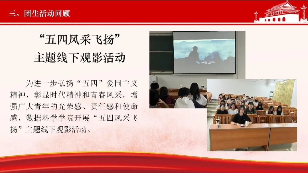 本月主要开展了“继五四志展少年风,担时代责铸青春魂”主题线上寄语感悟活动和“五四风采飞扬”主题线下观影活动,有助于进一步激发同学们的爱国情怀和奋斗精神,争做时代新青年,以积极向上的精神面貌投身祖国建设,努力学习,拼搏创新。
