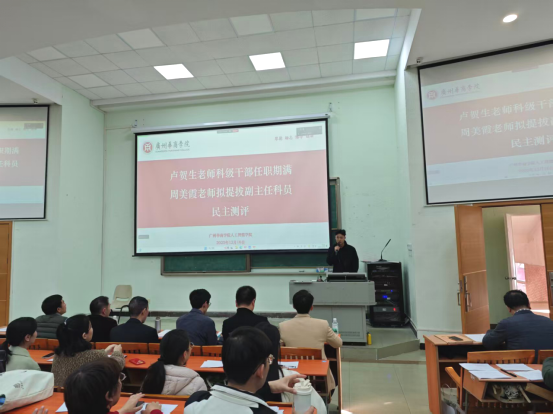 会议伊始,人事处肖泽林老师进行了卢贺生老师科级干部任职期满的考核民主测评,同时对拟提拔为副主任科员的周美霞老师进行了民主测评。此次民主测评不仅是对两位老师个人能力的认可与检验,更是学院加强干部队伍建设、提升管理效能的重要举措。通过测评,教师们对他们的工作有了更全面地了解,也激发了他们不断提升自我、服务师生的热情与动力,共同筑就了干部队伍建设的新篇章。