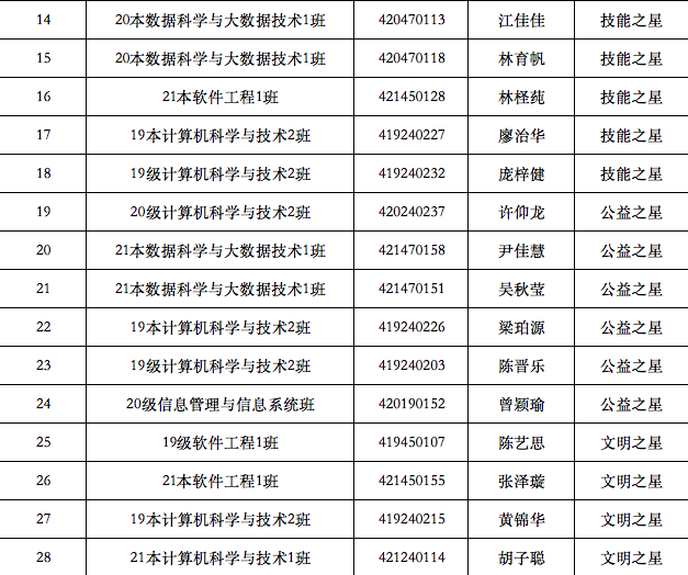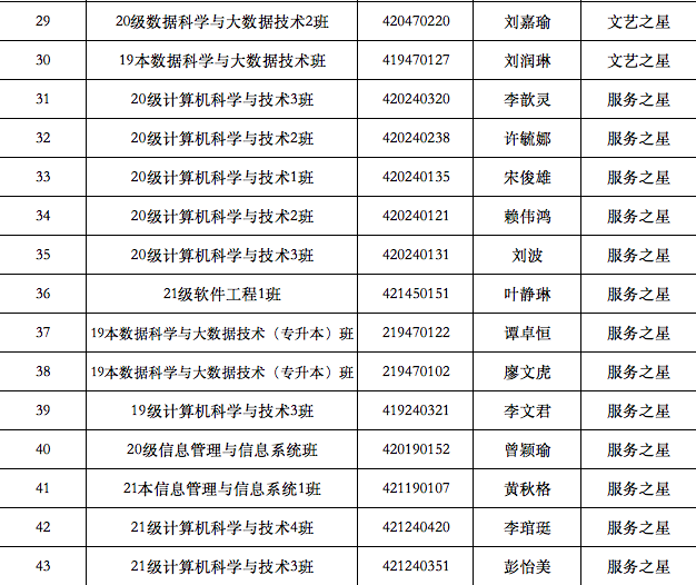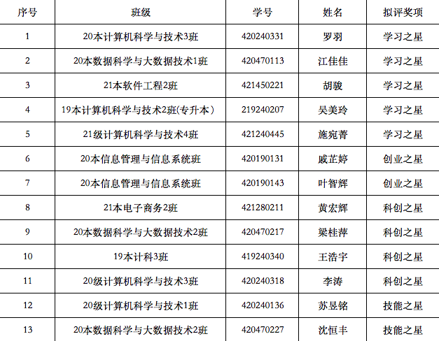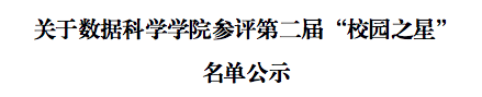 为深入贯彻习近平新时代中国特色社会主义思想,进一步培育和践行社会主义核心价值观,根据《关于评选第二届“校园之星”的通知》、《2138cc太阳集团“十大校园之星”评选办法》等文件精神,数据科学学院开展了相关评优工作,现将学习之星、创业之星、科创之星、技能之星、公益之星、服务之星、体育之星、文艺之心拟评名单公式如下: