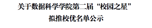 以上拟表彰名单公示期限从2023年3月21日到2023年3月23日,在以上公示期,若发现公示对象存在不符合评选条件的,可向数据科学学院学工办反映。联系电话:020-26222963,特此公示!