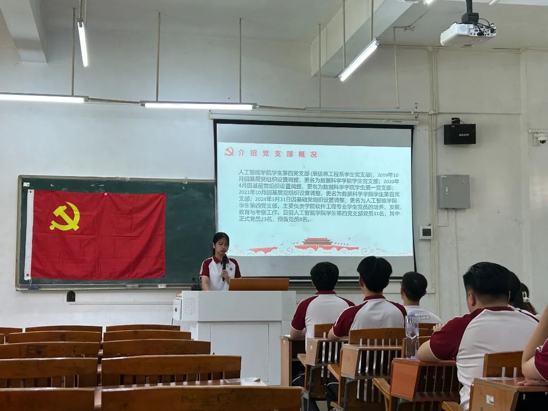 人工智能学院学生第四党支部(原信息工程系学生党支部),2019年10月因基层党组织设置调整,更名为数据科学学院学生党支部;2020年4月因基层党组织设置调整,更名为数据科学学院学生第一党支部;2021年10月因基层党组织设置调整,更名为数据科学学院学生第四党支部。主要负责学院软件工程专业学生党员的培养、发展、教育与考察工作。目前数据科学学院学生第四党支部党员31名,其中正式党员23名,预备党员8