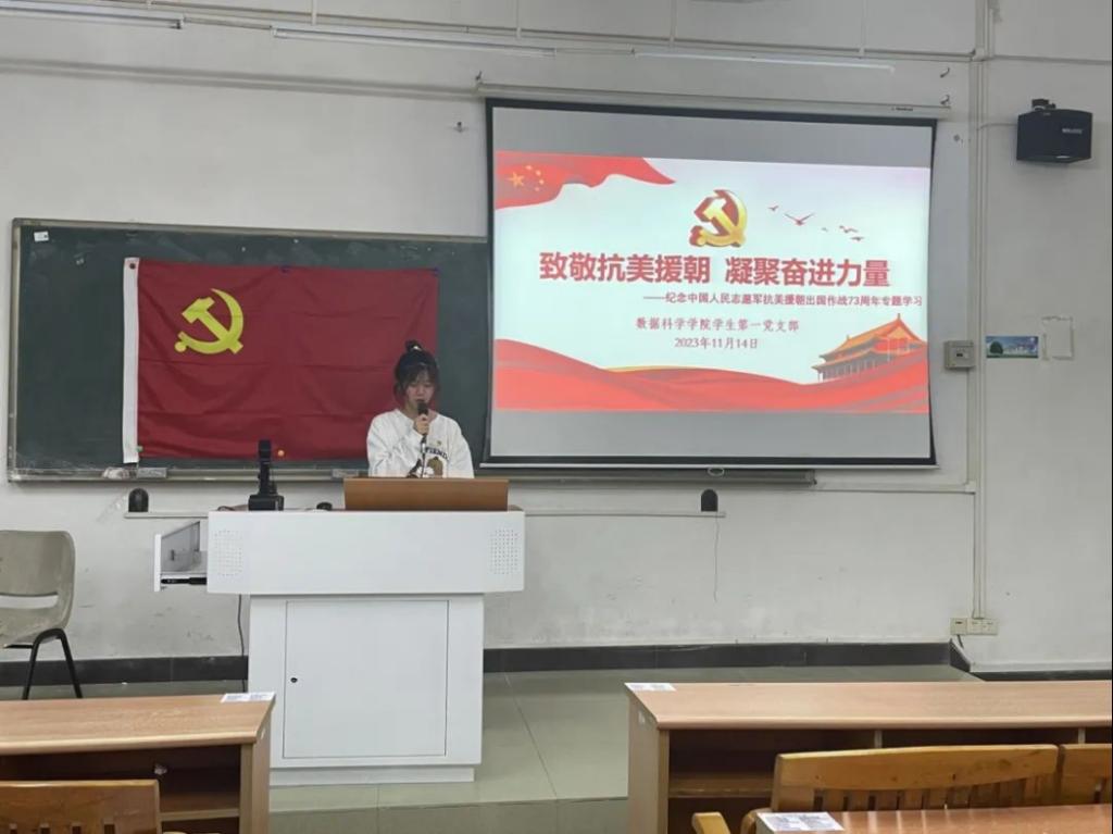 为纪念中国人民志愿军抗美援朝出国作战73周年,致敬革命先辈们的英勇付出,更好地弘扬和传承伟大抗美援朝精神,数据科学学院学生第一党支部于2023年11月14日17:45在励志楼D105开展“致敬抗美援朝,凝聚奋进力量”党日主题活动。出席本次会议的有数据科学学院学生第一党支部全体在校学生党员。本次活动由彭怡美同志主持。