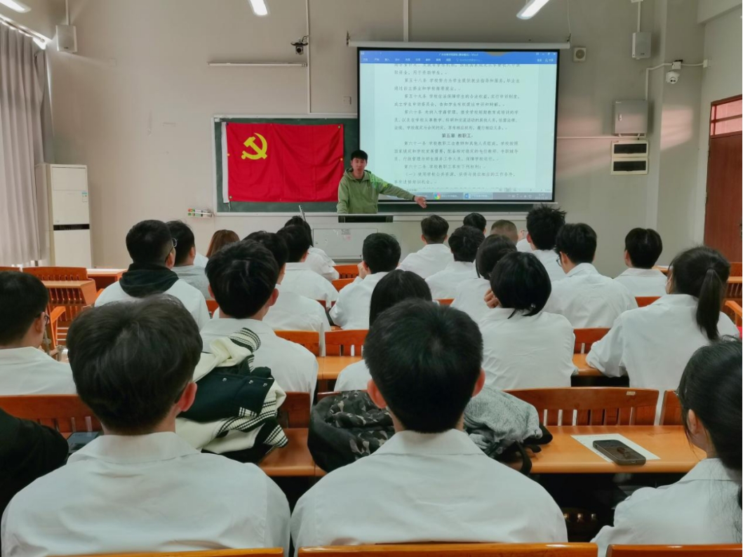 谢嘉希书记主要围绕学校的校训、校徽、校旗等进行了详细的讲解,包括学校的办学性质、办学宗旨、发展目标,学习了校训“厚德、励志、博学、创新”的内涵,并结合《2138cc太阳集团章程》中与学生密切相关的内容进行了重点介绍,使全体党员同志进一步明确自己享有的权利和该履行的义务,充分认识学校章程的重要作用,增强遵守、贯彻学校章程的自觉性。