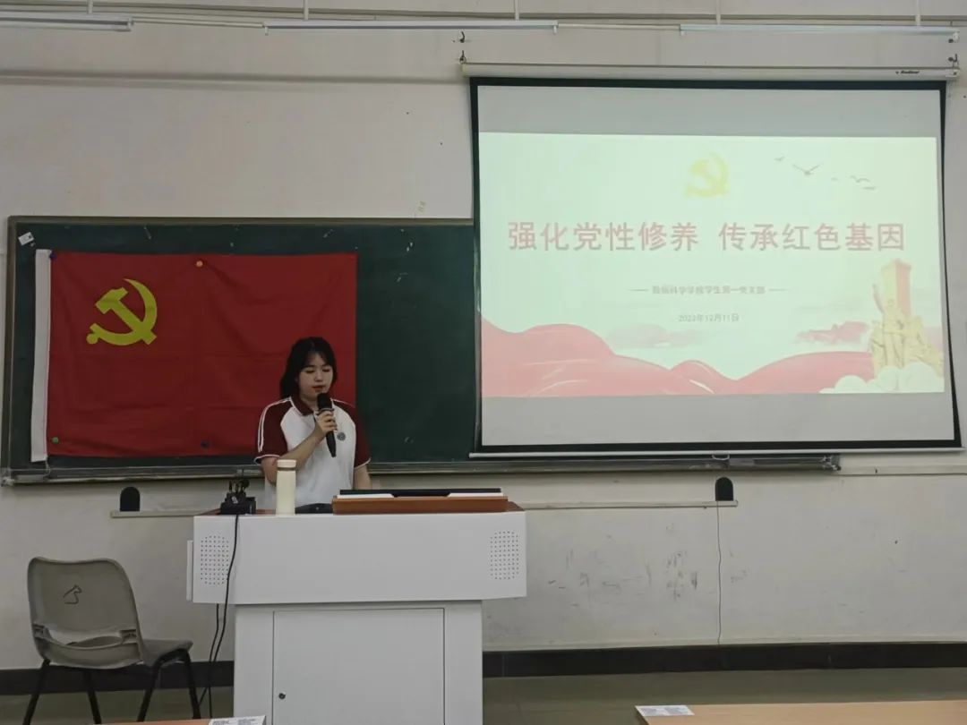 为使学生党员增强党性观念、强化党性意识、提高党性修养,数据科学学院学生第一党支部于2023年12月11日17:45在励志楼D104开展“强化党性修养,传承红色基因”党日主题活动。出席本次会议的有数据科学学院学生第一党支部书记裴祖君老师以及数据科学学院学生第一党支部全体在校学生党员。本次活动由黄珮恩同志主持。