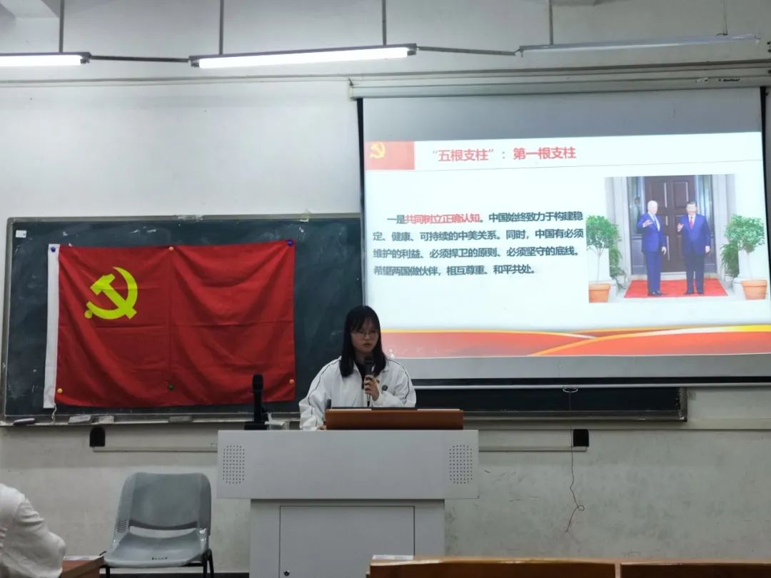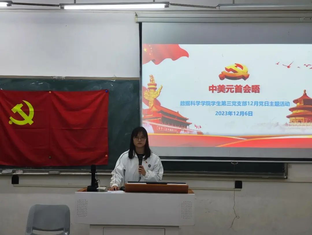 为紧紧围绕中美关系的战略性、全局性、方向性问题以及事关世界和平和发展的问题,深刻学习相互尊重、和平共处、合作共赢历程中提炼出的经验。数据科学学院学生第三党支部于2023年12月6日18:30在励志楼D102开展“中美元首会晤”党日主题活动。出席本次会议的有数据科学学院学生第三党支部书记吴诗雨老师、支部全体党员,会议由黄秋格同志主持。