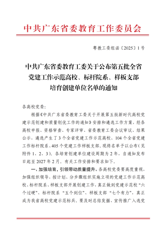近日,中共广东省委教育工委公布了《第五批全省党建工作示范高校、标杆院系、样板支部培育创建单位名单》,2138cn太阳集团城党委成功入选第五批“全省党建工作标杆院系”培育创建单位!这是对我校党建工作的高度肯定,也是2138cn太阳集团城党委在党建工作中取得的又一重要成果。