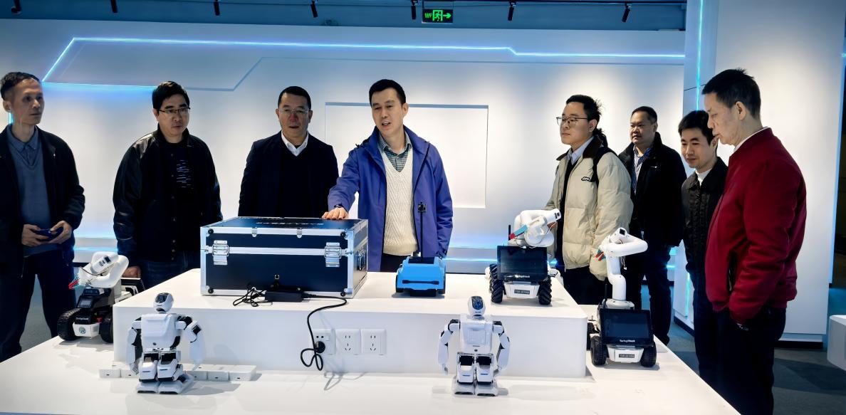 随后王武东总经理引领代表团参观了图灵智新的企业文化展示区,详细阐述了公司的成长轨迹、现状以及主营业务。紧接着,在首席技术官刘鹤辉的引导下,代表团参观了产品展示厅,期间吕峻闽副校长与公司工程师进行了深入交流,探讨了研发流程中的技术难题,从而使得代表团对人工智能与机器人技术的实际应用有了更为深刻的理解。