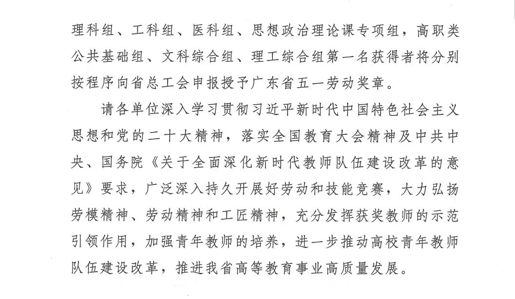 2023年2月8日,广东省总工会、广东省教育厅公布了关于广东省第六届高校青年教师教学大赛获奖情况的通报,我校教师周国辉获文科组三等奖、何璐琪获工科组三等奖、贺艳春获工科组三等奖。 硕果累累承荣誉,砥砺奋进创佳绩!我们将以荣誉作为前进的动力,充分发挥优秀教师模范作用,推动学校教育教学再上新台阶,助力学校持久发展!