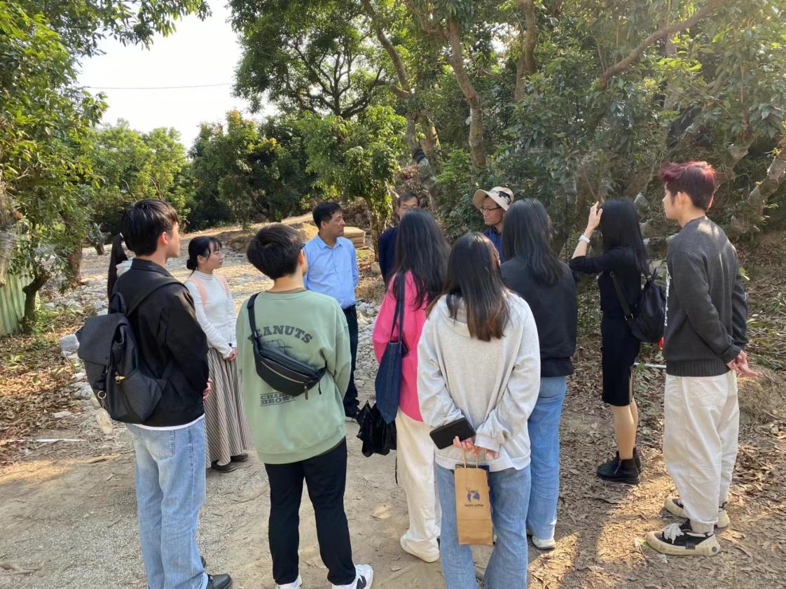 1月7日,老师带领9名学生一同前往广州增城区荔城街庆丰村马屋村的荔枝果园开展乡村振兴项目考察。