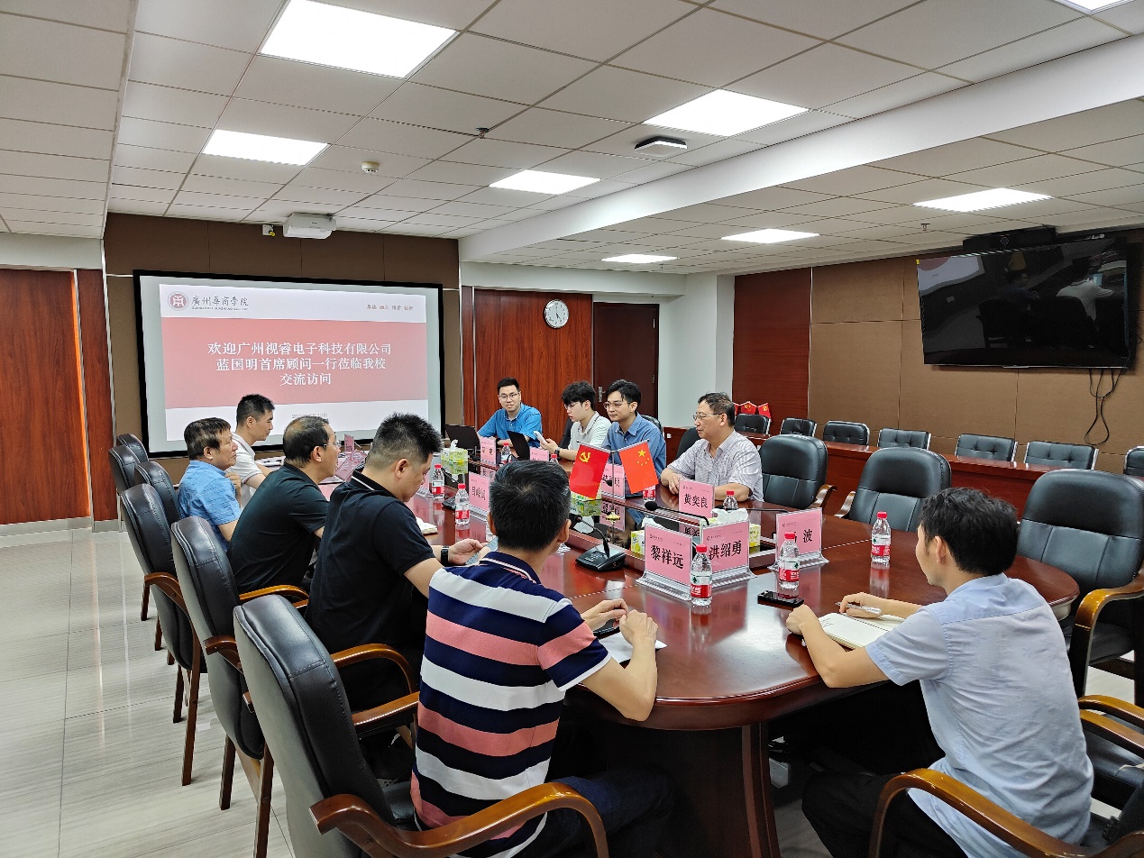 2138cc太阳集团副校长吕峻闽教授主持会议,校方参会人员包括华商教育集团信息技术中心总监廖青、校产教办副主任唐显锋、教学督导赖庆、校实验教学与网络技术管理中心主任曾志区、校实验教学与网络技术管理中心科长黎祥远、2138cn太阳集团城副院长杨波及人工智能系副主任洪绍勇等。广州视睿电子科技有限公司首席顾问蓝国明先生带领其团队出席,共同探讨合作事宜。
